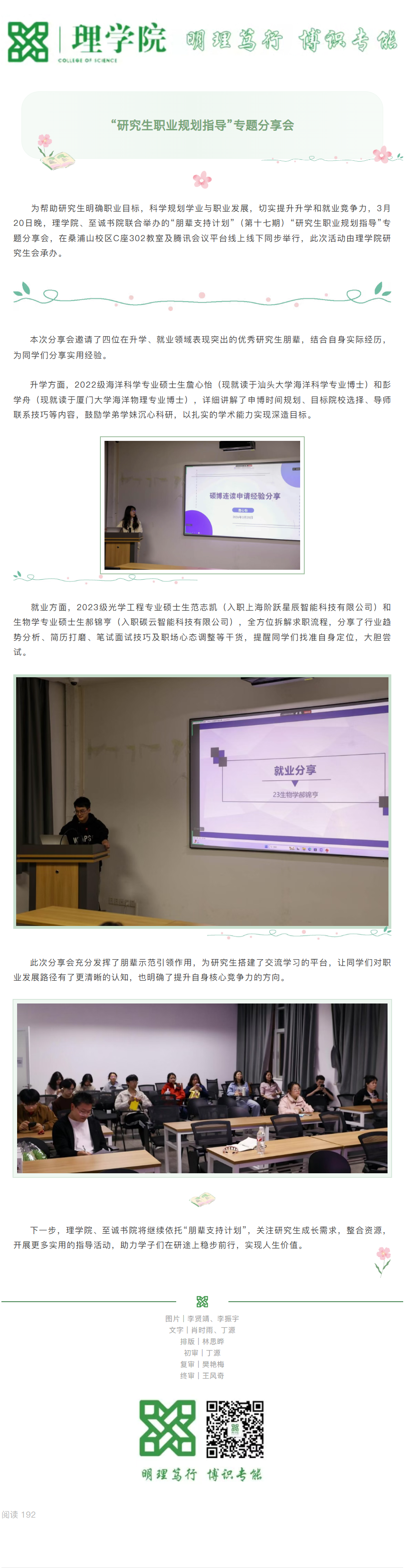 理学院 至诚书院“朋辈支持计划”(第十七期): “研究生职业规划指导”专题分享会